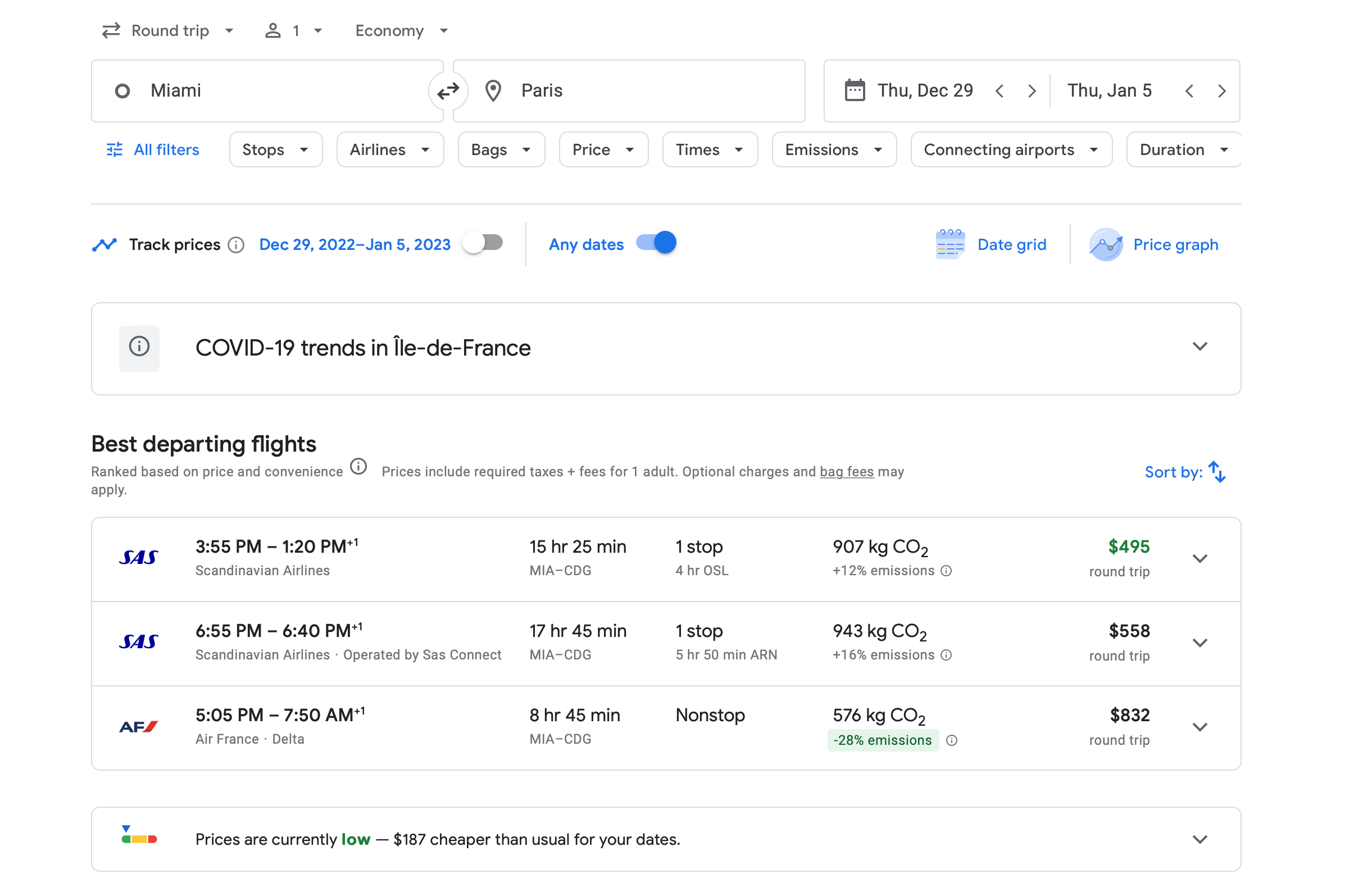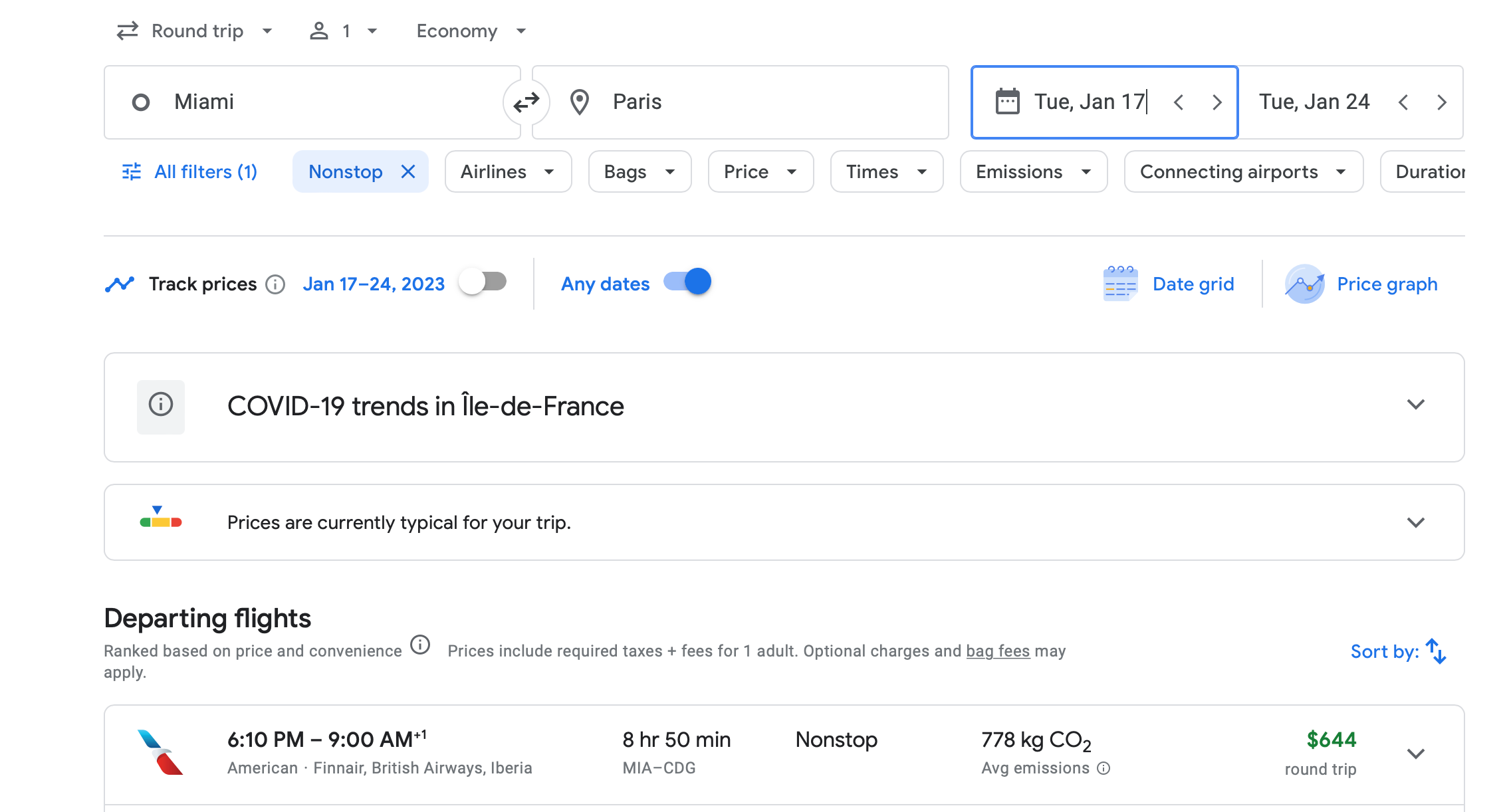 Prices: Fares start at $281 one-way for basic economy and $641 one-way for premium economy from Miami to Paris in December, dropping to $210 in January.