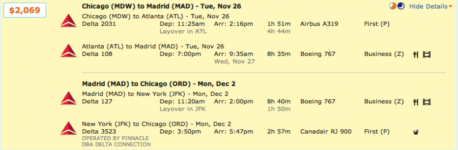 One of the better options was taking Delta from Chicago to Madrid via Atlanta on the outbound and returning through JFK with both the domestic flights in first class for $2,069.