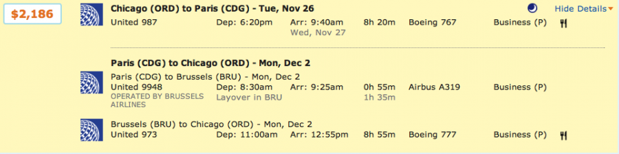 As well as flying Chicago to Paris on United returning through Brussels for $2,186.