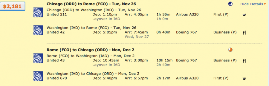 Chicago to Rome on United through Dulles also clocked in at $2,181.