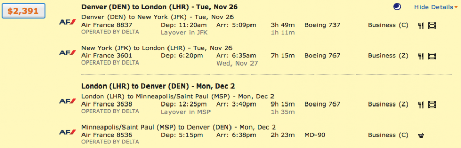 Finally, just for some variety, I searched for some Denver fares and found this one to London through New York and returning through Minneapolis/Saint Paul on Delta for $2,391.