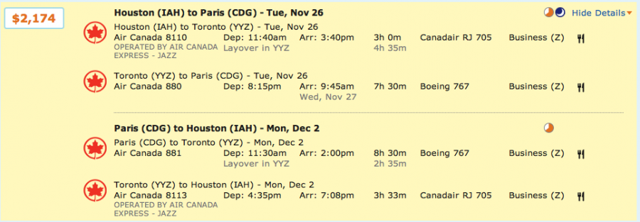 - Houston to Paris on Air Canada through Toronto (IAH-YYZ flights are operated by Air Canada Express Jazz) for $2,174 total roundtrip (10,062 miles).