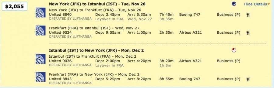 While I wouldn't call $2,000 business class airfare an amazing deal, it's still a better figure than what you'll be paying to fly a week later on the same routes, which is more in the range of $3,325 on the non-stop from Turkish Airlines.