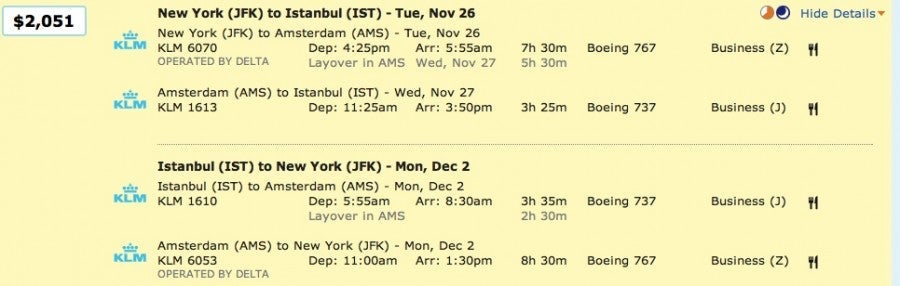 Or if you're a SkyTeam flyer, you can travel JFK to Istanbul on Delta through Amsterdam (the AMS-IST flights are operated by KLM) for $2,051.