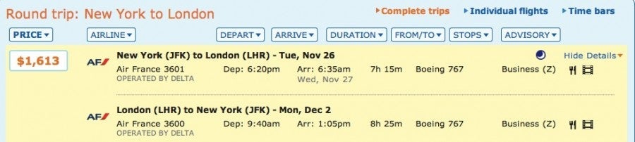 JFK to London on Delta for $1,613.00 (codeshare with Air France), departing on November 26 and returning on December 2. The Delta 767 aircraft are fitted with the BusinessElite seats with 60 inches of legroom and 160-degree recline.