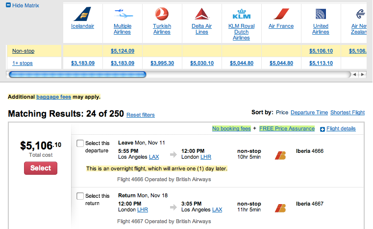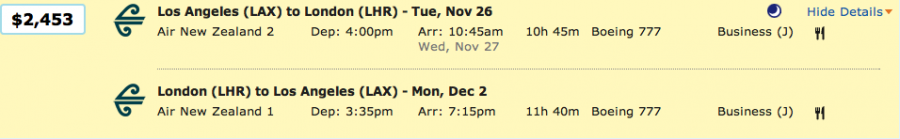 Still, it's a far cry from nonstops from Los Angeles to London on British Airways November 11-18, which would cost $5,1o6.10 - over twice the price of the Thanksgiving weekend Air New Zealand flight.