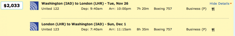 - London on United for $2,033 total roundtrip (7,906 miles)