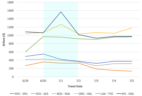 Based on our observations, we can safely say that flying out on Friday (6/30) and Saturday (7/1) may not be a good idea if price is of concern to you (as highlighted in the chart above). Prices generally fall as you travel later in the long weekend, with most routes offering the best deal if you choose to fly on July 3. It really becomes a trade off between how much you are willing to pay, and how much time you want to spend abroad. While fares may be cheap, it may not give you the maximum value given how you won't be able to take advantage of the long weekend.