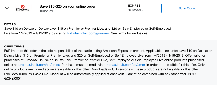 A host of American Express cards are offering $20 off TurboTax's Self-Employed or Self-Employed Live software, while you'll get $10 to $15 back on its lower-tiered products. We spotted this offer on our Hilton Honors American Express Aspire Card, but it should find its way to most every Amex card. To check, visit "Amex Offers" in your online web profile or on the Amex app.