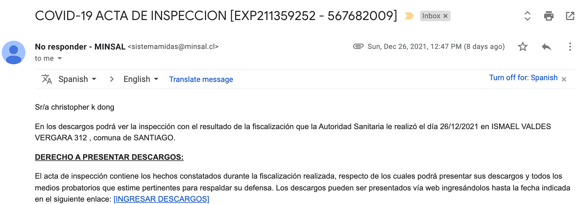 Although I don't speak much of the language, I could tell what it said almost without reading it. Earlier that day, a health official conducted an inspection of my original hotel in Santiago and found that, well, I wasn't there.