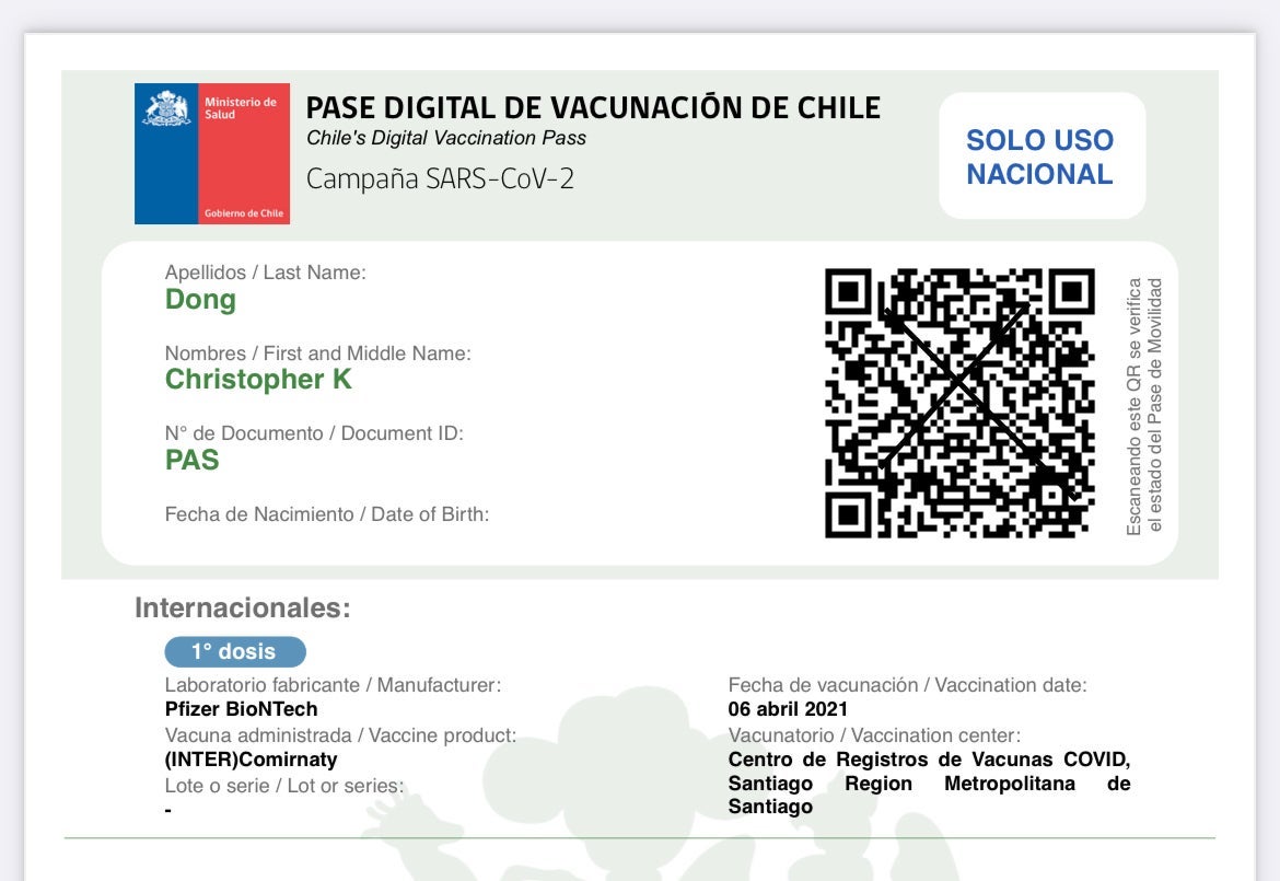 Even though both Pfizer shots are displayed on my official U.S. Centers for Disease Control and Prevention-issued vaccine card that I uploaded online, unknown to me, Chilean health authorities only registered the first dose on my pass. How this was possible, I still do not know to this day.