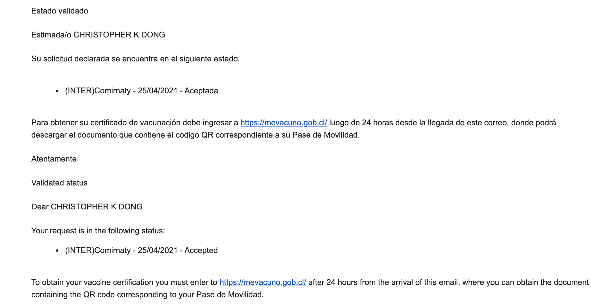 At this point, I also began the process of reaching out to the U.S. Embassy in Chile and any contacts that I could find to get my situation sorted out or, if that proved unsuccessful, to expedite the approval of my second Pfizer dose.