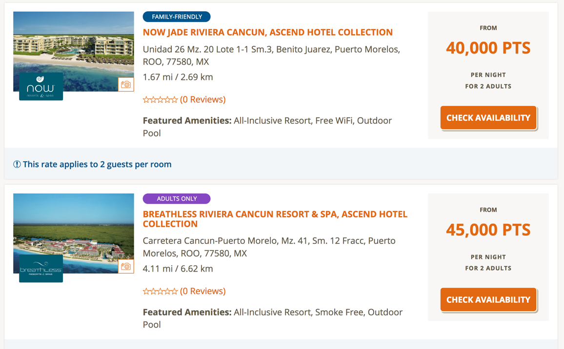 Keep in mind many of these resorts are available to book with flexible points through bank sites like the Chase Ultimate Rewards travel portal. This could be a better option if you don't have Choice points at your disposal. For instance, you'd pay just over 30k Chase points per night the Breathless Riviera Cancun Resort and Spa when you have the Chase Sapphire Reserve and redeem Chase Ultimate Rewards points at a rate of 1.5 cents each: