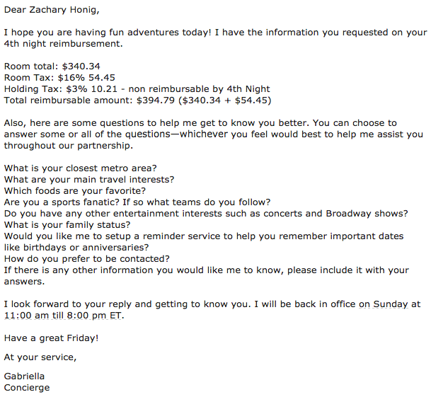 Gabriella sounds more than qualified — from another intro email, it's clear that she's a well-traveled college grad, and even had experience as a concierge at Disney World, which is known for being pretty selective about its hires. She confirmed that she can help make dining recommendations and reservations, locate event tickets, book transportation, assist with flower and gift deliveries, and provide other services: "Whether you need anniversary reminders, a local dry cleaner, a list of child-friendly restaurants, a stroller rental or a magician for a birthday party, I can assist with multiple everyday (and not so everyday) requests."