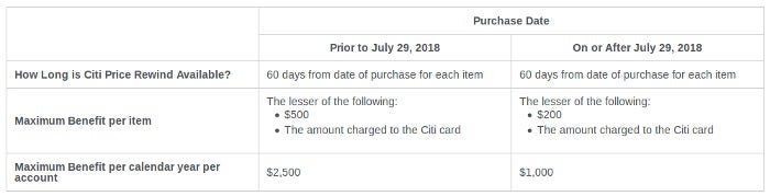 Some of this has already been reported. In early April, we learned that the Price Rewind program would be devalued effective July 29. Instead of being able to claim up to a $500 refund per claim and $2,500 per calendar year, many Citi cards will be limited to $200 per claim and $1,000 per calendar year for purchases starting July 29, 2018.