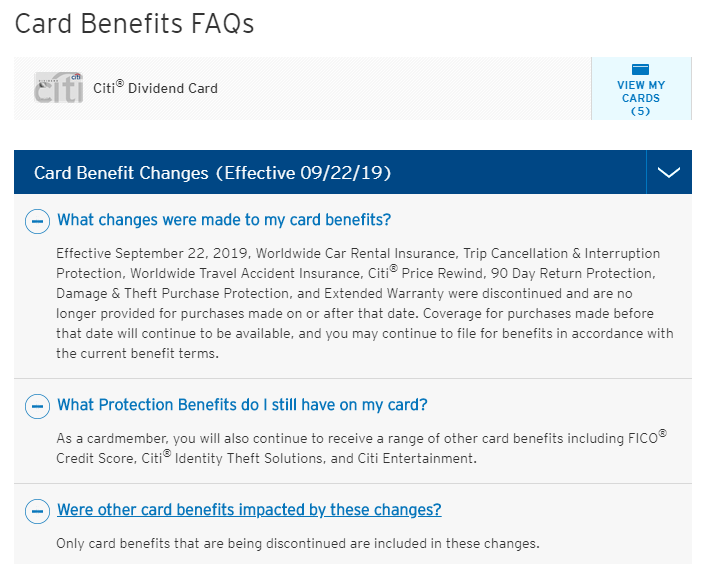 So, it's not surprising that when I log into my Citi Dividend account, I only see "Guide to Protection Benefits effective prior to 9/22/19" -- there's no current guide to benefits.