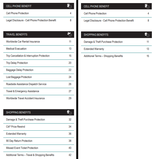 Likewise, when I log into my Citi Prestige account and download the new guide to benefits effective September 22, 2019, the table of contents is very short compared to the previous version:
