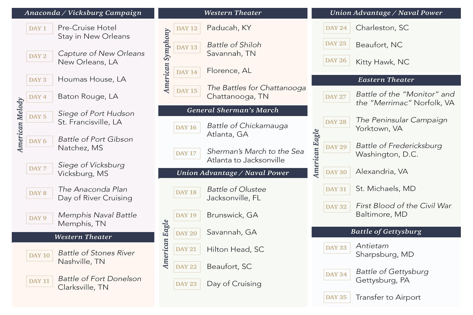 Along the way, the itinerary includes calls on destinations in Mississippi, Tennessee, Kentucky, Alabama, Georgia, Florida, South Carolina, North Carolina, Virginia, Maryland and Washington, D.C., before ending on June 6, 2024, in Gettysburg, Pennsylvania. Stops offer a chance to visit key locations such as Fort Sumter, Antietam National Battlefield and Bull Run.