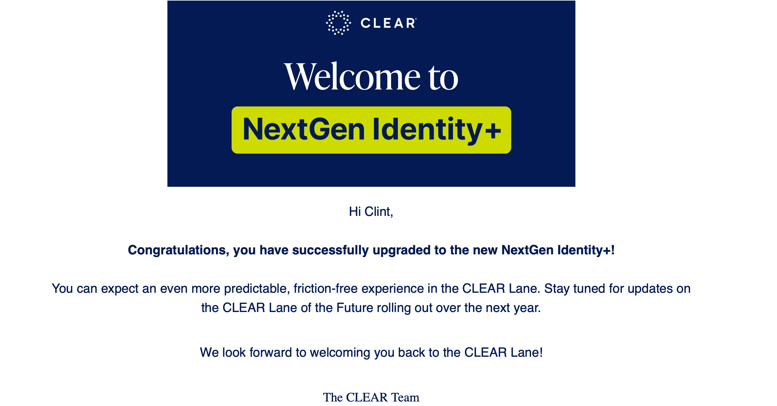 After you take a new picture and show your ID to a Clear agent at the airport as part of the re-verification process, you should receive an email indicating you've successfully re-verified to NextGen Identity+.
