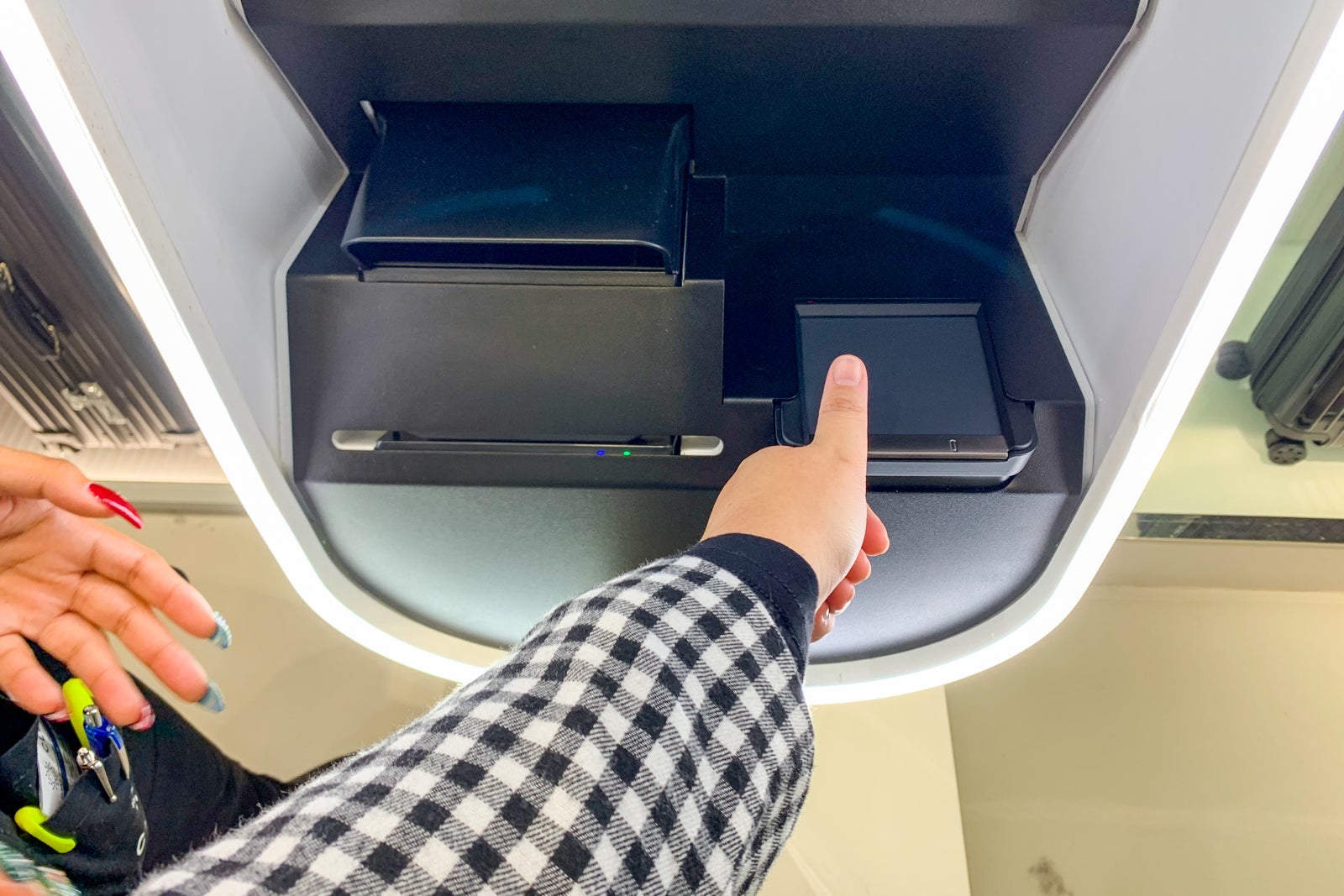 You'll go through a retina scan, thumbprint scans and larger four-finger scans to get your biometrics recorded. The Clear ambassador helps you through the process to make sure your hands are situated correctly, you have your eyes open wide enough for the scan, etc.