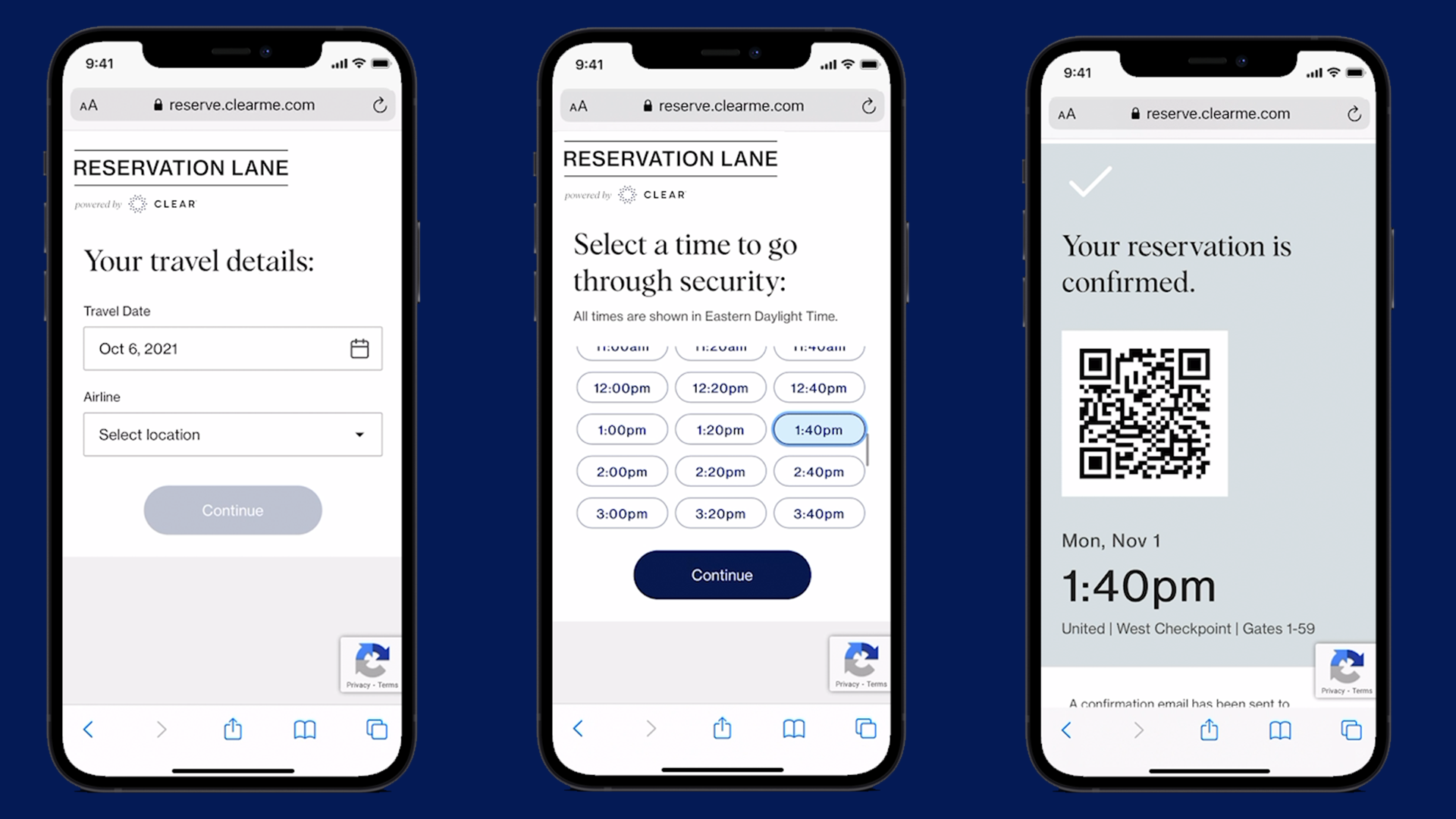 Alternatively, travelers can sign up for a time slot on the spot as they approach security. Picture this: You are walking up to security, presumably already frazzled after just making it to the airport, and see that inevitable long security line. You head to the Clear kiosk and are told they have an opening for timed entry in 30 minutes, which would enable to you go grab a Starbucks, go the bathroom and overall alleviate some stress about traveling during an already stressful period.