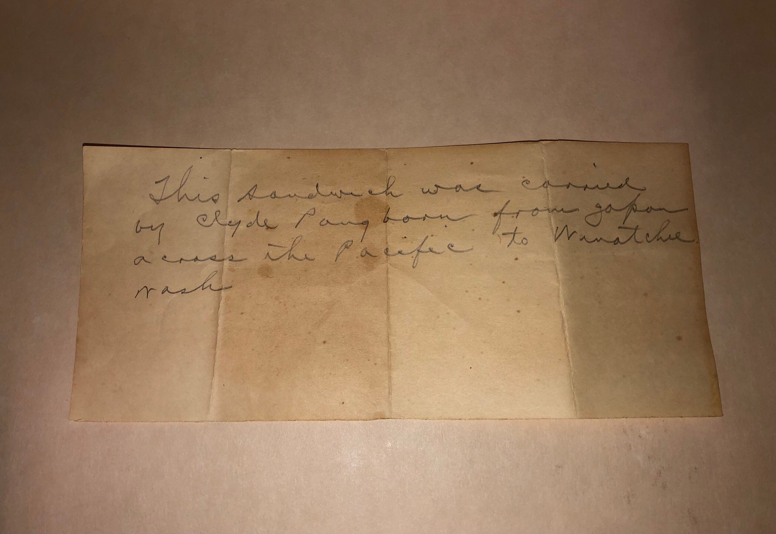 The exact date Pangborn traveled with this sandwich — and perhaps ate the other half — remains a bit uncertain. That's because when it was donated to the museum by a man who found it inside a red tobacco tin among his late father's belongings, there was a neatly handwritten note with it stating that the sandwich had flown on the 1931 flight.
