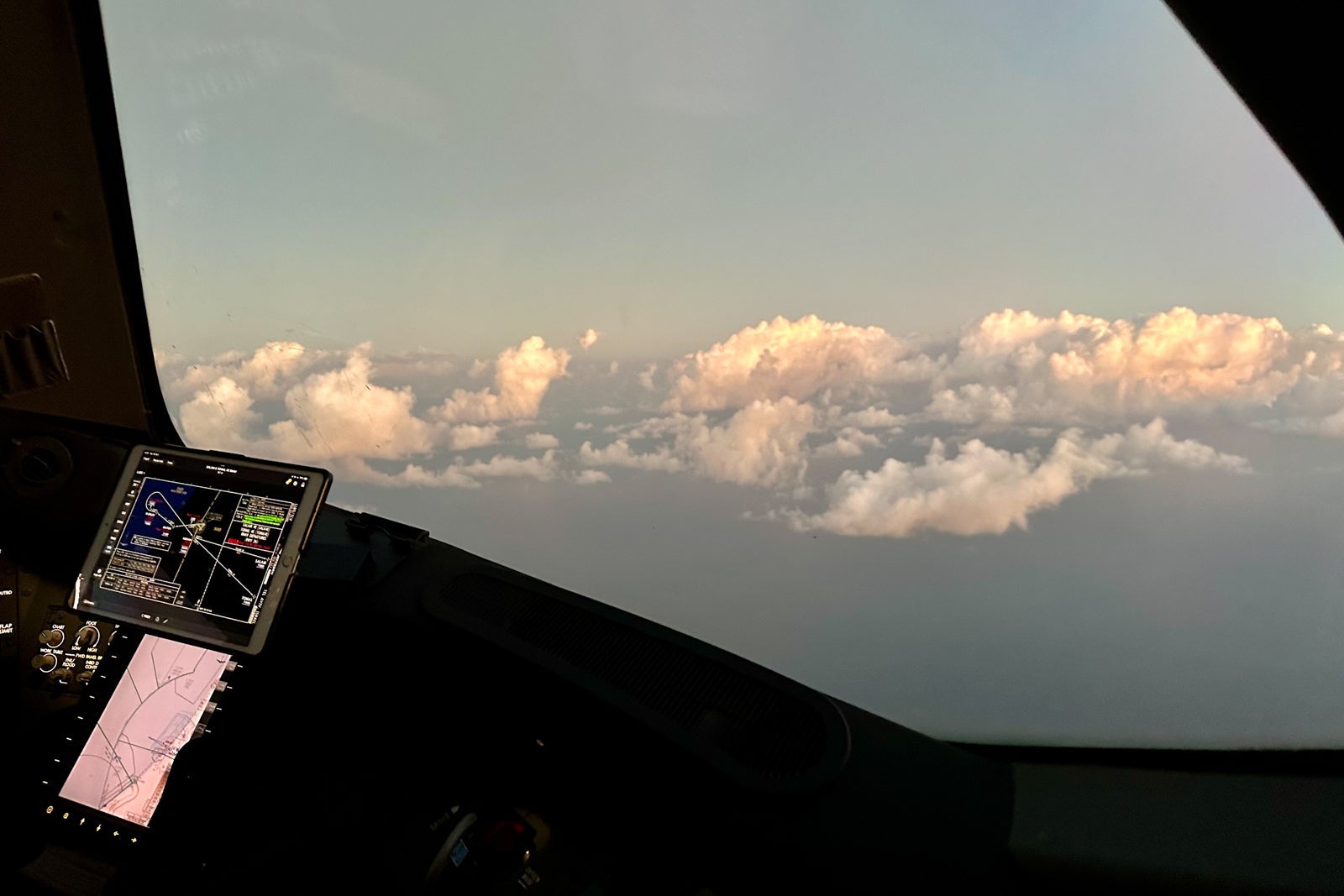 As we headed east, we caught our first glimpse of daybreak, which looked much prettier from the expansive cockpit windows than from the passenger windows behind me.