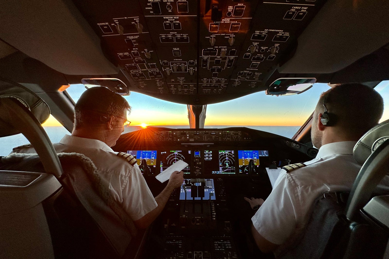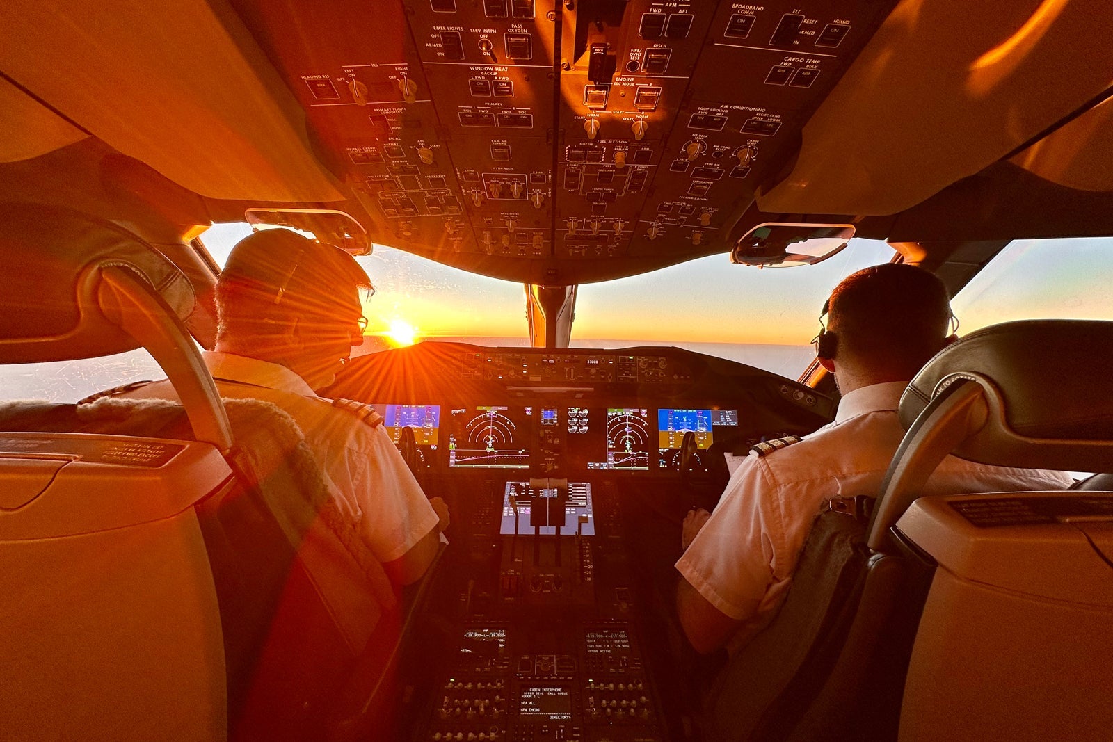As the two pilots pushed some buttons, my eyes were drawn to the sunrise, which happened much quicker than it would on terra firma as we were flying in the direction of the sun at over 400 miles per hour.