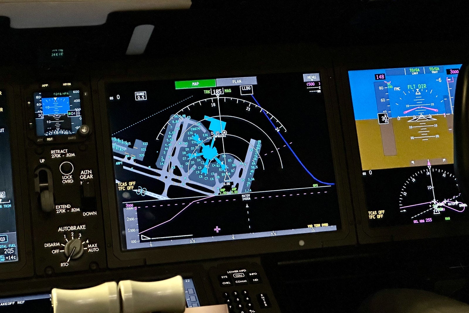 By this point, the pilots had activated their heads-up displays, which provide an overlay of the primary flight information, while allowing the pilots to stay focused on the outside environment. (These displays weren't used during departure due to a GPS calibration issue.)
