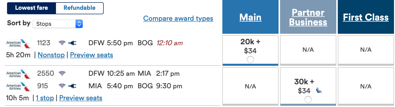 There are quite a few airlines that head to Colombia from the US, with flights from American Airlines, Avianca, COPA, JetBlue, Spirit and United. As TPG found, award availability tends to be best from American Airlines, with nonstops generally available via Dallas Fort Worth (DFW) or Miami (MIA).