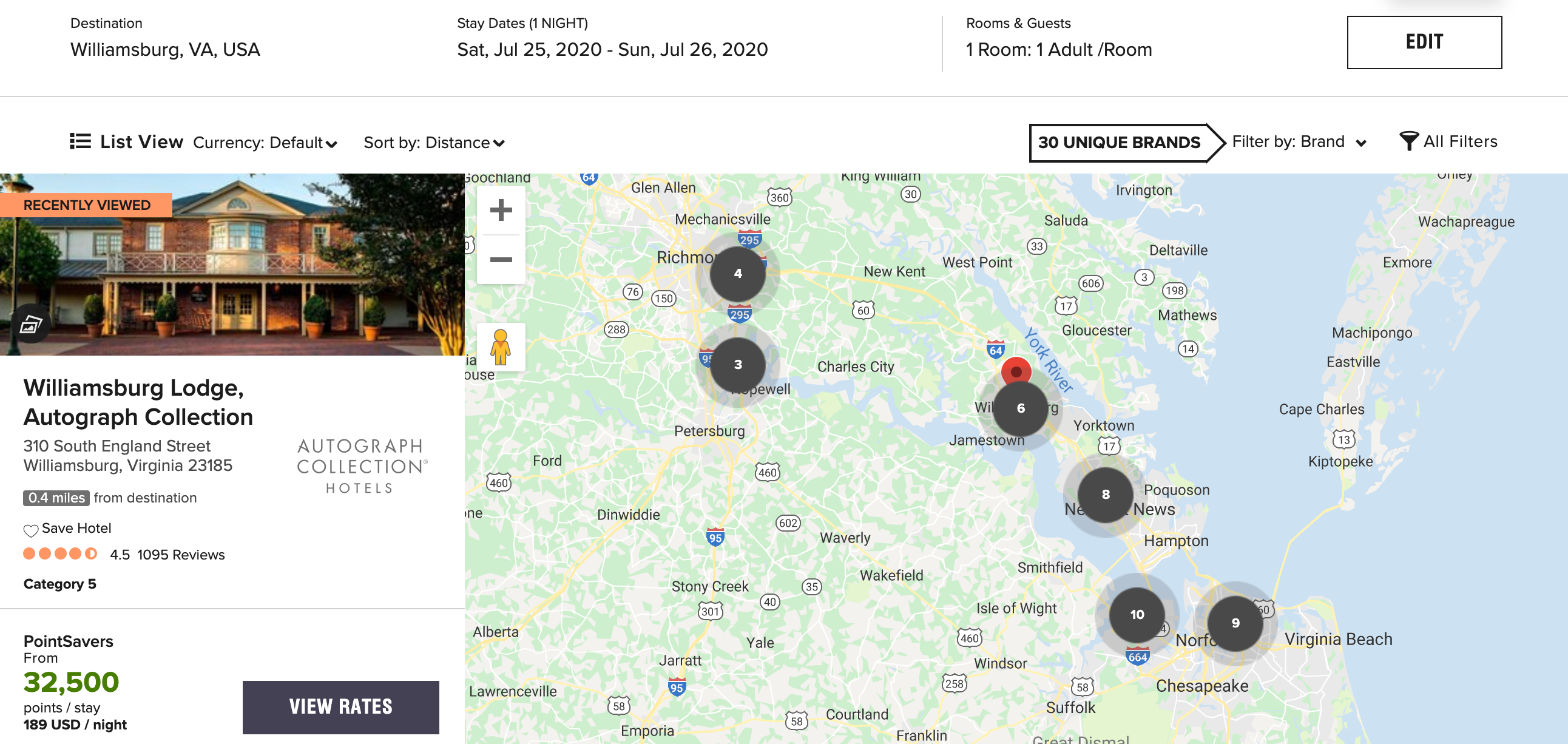 I was drawn to Williamsburg, Virginia by Marriott's hotel map. I have several extended free night certificates to use up by January 31, 2021, so I was looking for a high-end hotel that fell within my certificate's 35,000-point nightly cap — ideally, one located about halfway between Philadelphia and my destination in North Carolina. I landed on a Category 5 property, in what we've recently declared to be Bonvoy's latest "sweet spot."