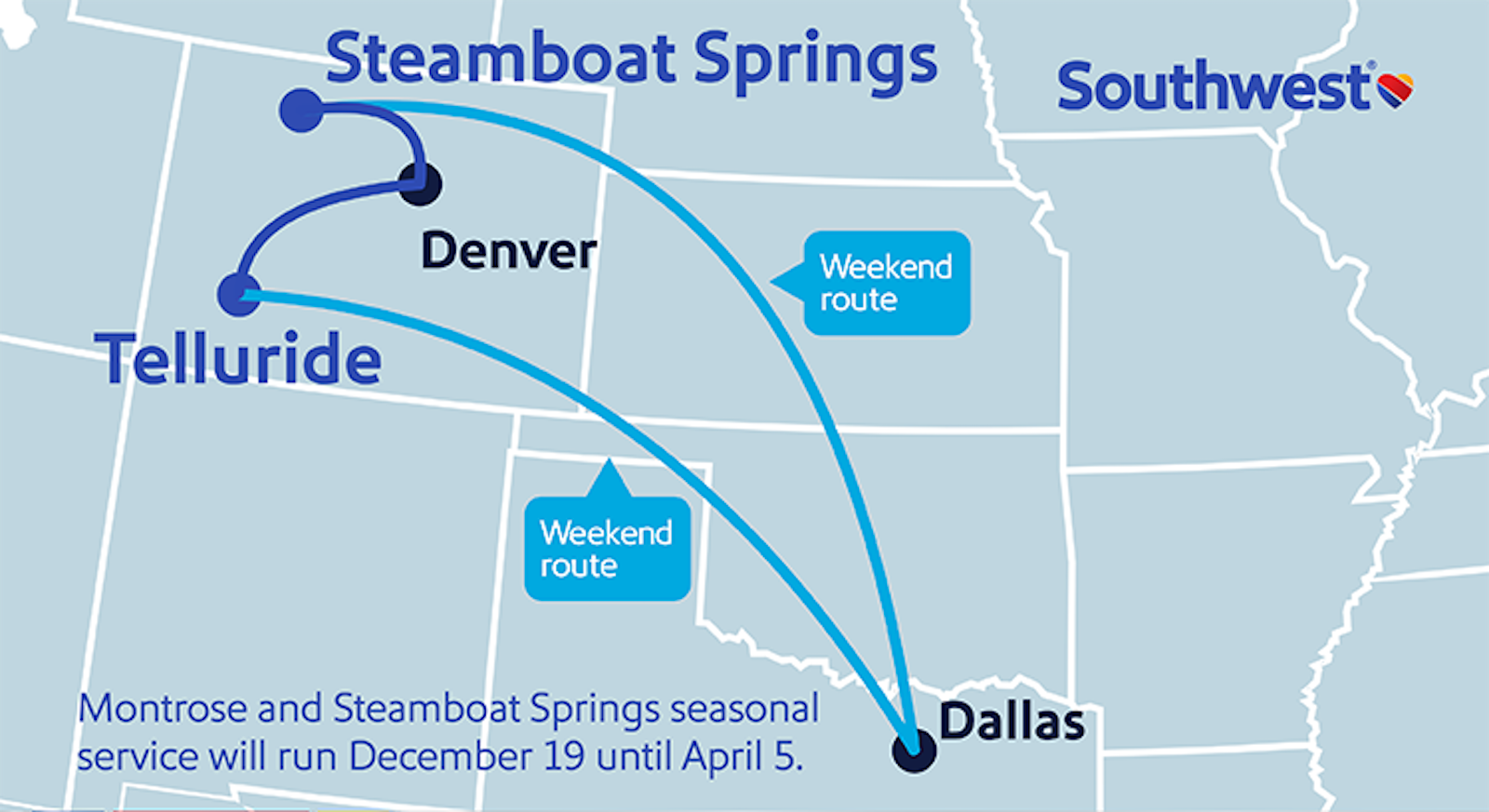 Dallas-based Southwest will connect both Montrose, which is near the resort town Telluride, and Steamboat to its Dallas Love Field (DAL) and Denver (DEN) bases beginning Dec. 19. It will offer up to four flights a day to both mountain towns through April.