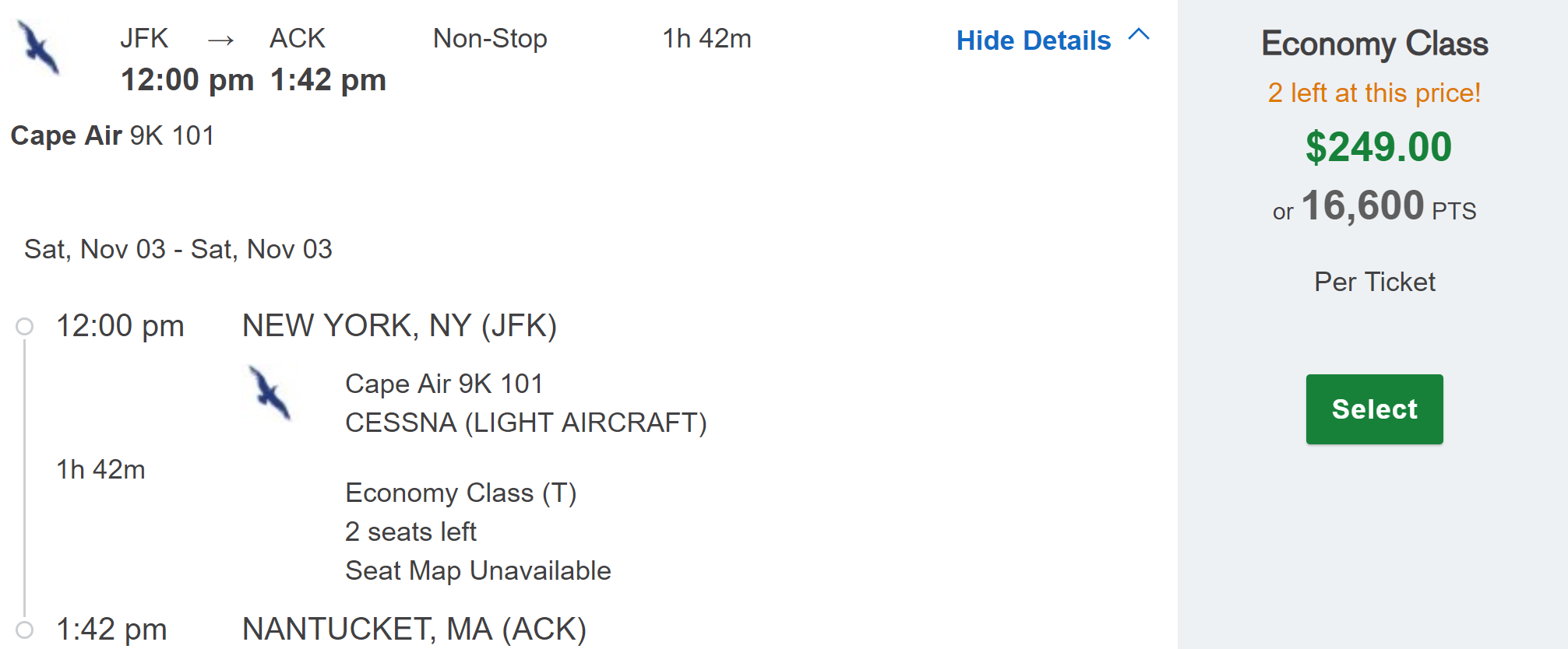 Using Miles/Points: American Airlines, JetBlue and United are mileage partners of Cape Air. However, there currently aren't any options to book this route with miles. AAdvantage only allows you to redeem AA miles for certain Cape Air flights to/from St. Louis (STL), while JetBlue is showing this route as "sold out" on all dates. And, although United says "you can book award travel on Cape Air through united.com," there aren't any available award options for the entire October-May schedule.