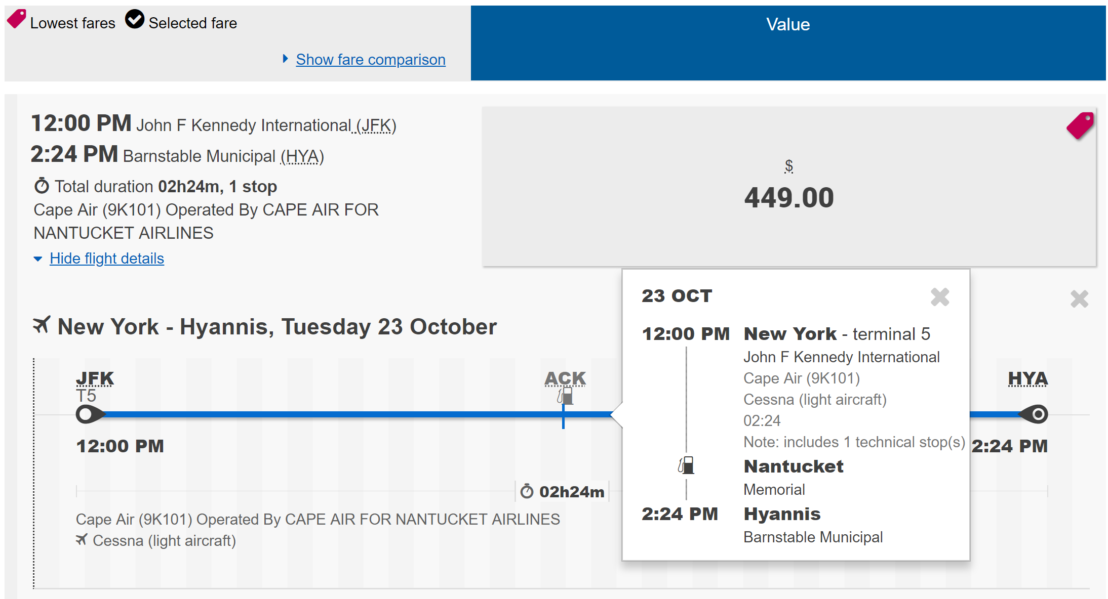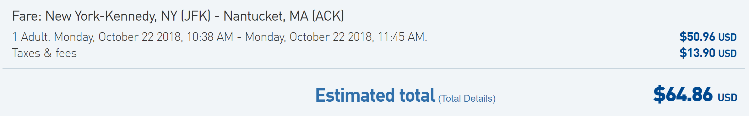 Price: The downside of the Cape Air experience is that it's not going to come cheap. The last-available seat on the inaugural flight from New York's JFK to Nantucket costs $499 one-way. Or, you can cut this price to $449 by booking a one-way from JFK to Hyannis (HYA) via Nantucket (ACK):