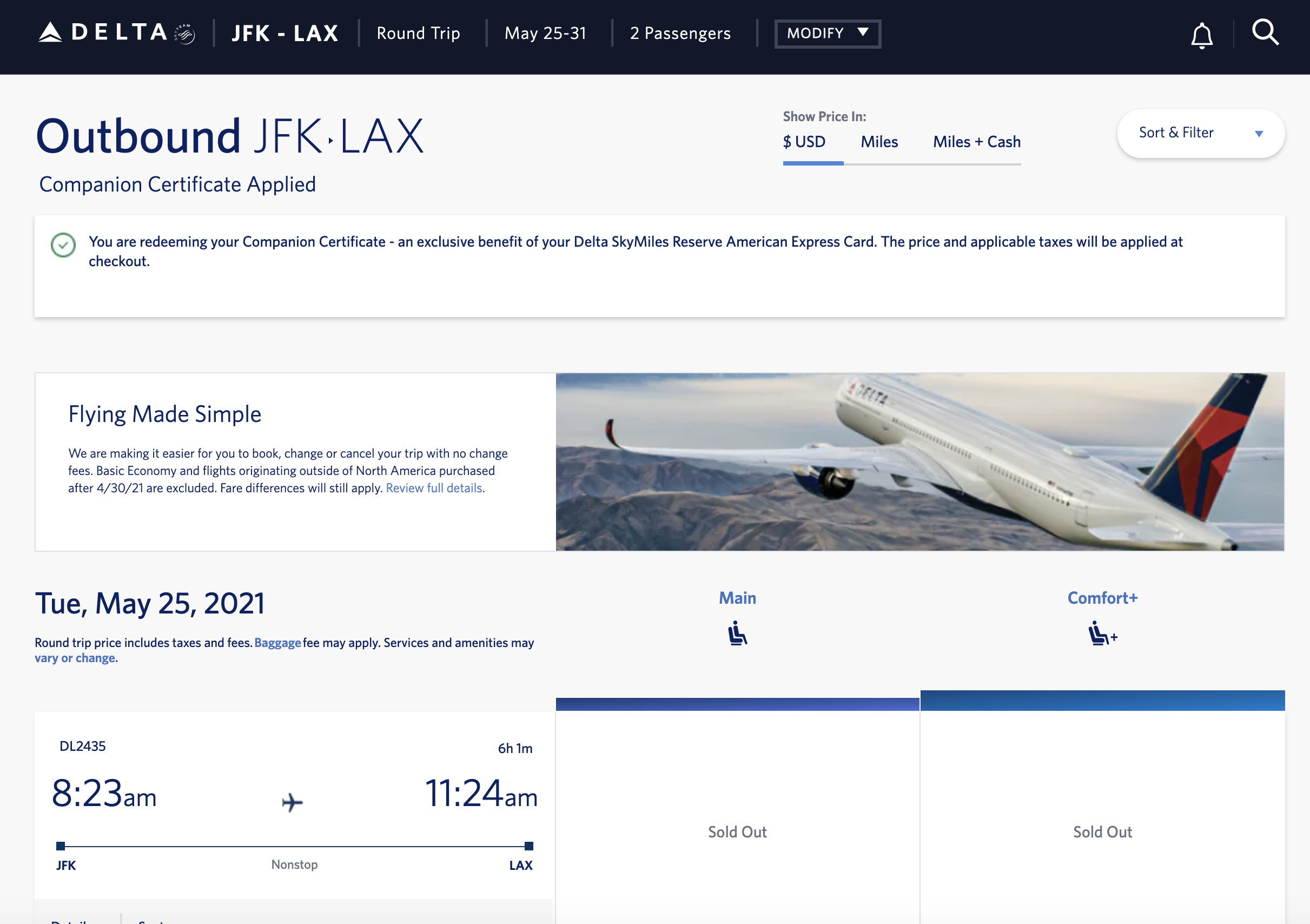 We've also had trouble finding eligible first-class flights on many routes — if you come across a flight that meets the fare class requirements, you may want to call Delta's reservations line at (800) 221-1212 to see if an agent can book your companion trip. Meanwhile, economy and Comfort+ should be a bit easier to come by: