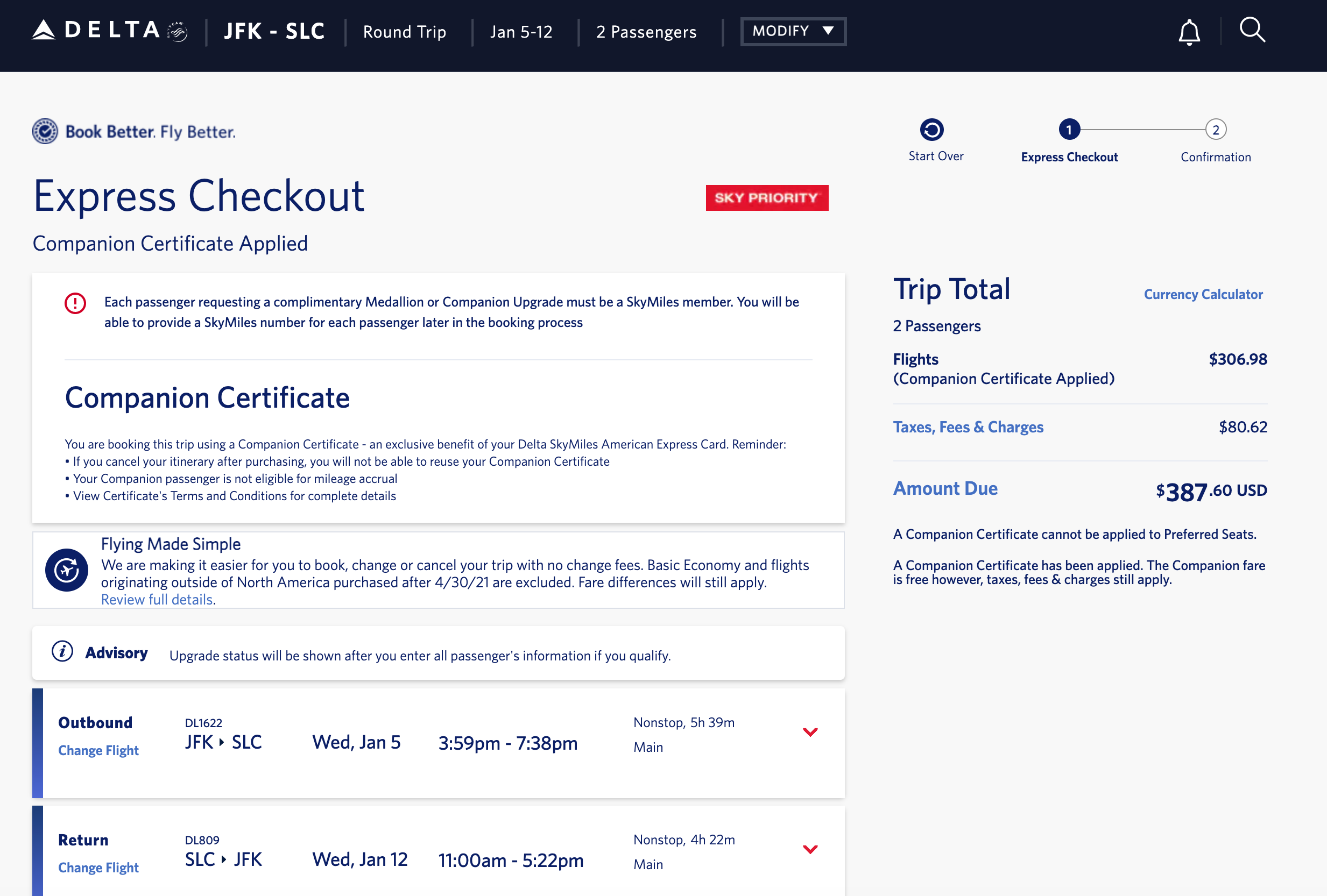 All companion tickets can only be used on round-trip tickets within the contiguous United States. Residents of Alaska, Hawaii, Puerto Rico or the U.S. Virgin Islands can originate from those destinations to travel to the 48 contiguous states, based on the address attached to your SkyMiles account.