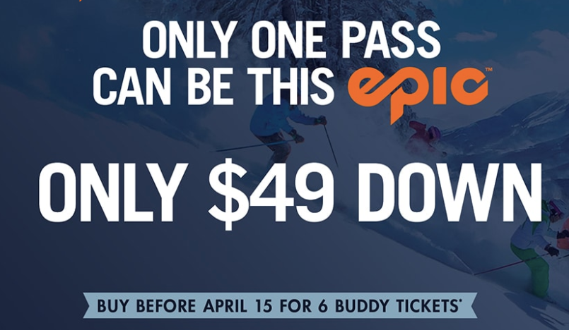 All of those passes are available now for $49 down. If you purchase an unlimited Epic Pass by April 15, 2018, you get six included discounted buddy passes.