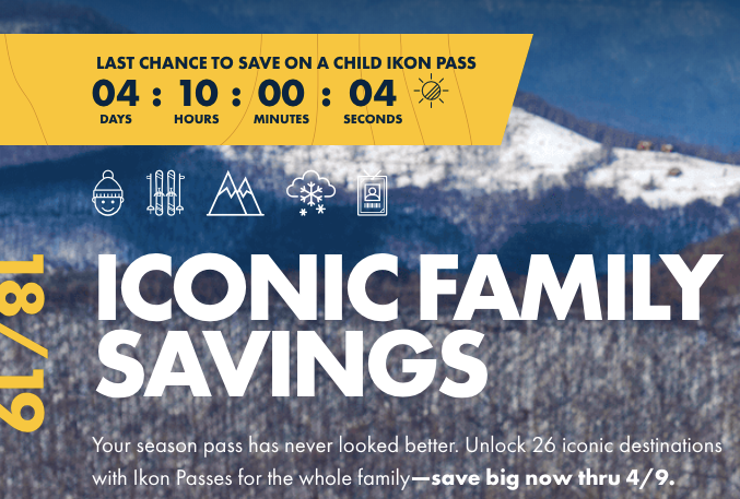 On April 9th, the price of a child's pass goes from the prices above to $449 for the full IKON Pass and $299 for the IKON Base Pass. Be aware that the ages of children in terms of which pass to purchase is based on the date of purchase, so purchasing a milestone birthday that would bump a child to a higher price category is a good idea.