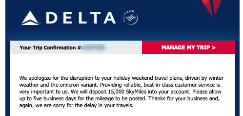 In an auto-generated email to an affected TPG reader, Delta wrote that "we apologize for the disruption to your holiday weekend travel plans, driven by winter weather and the omicron variant. Providing reliable, best-in-class customer service is very important to us. We will deposit 15,000 SkyMiles into your account."