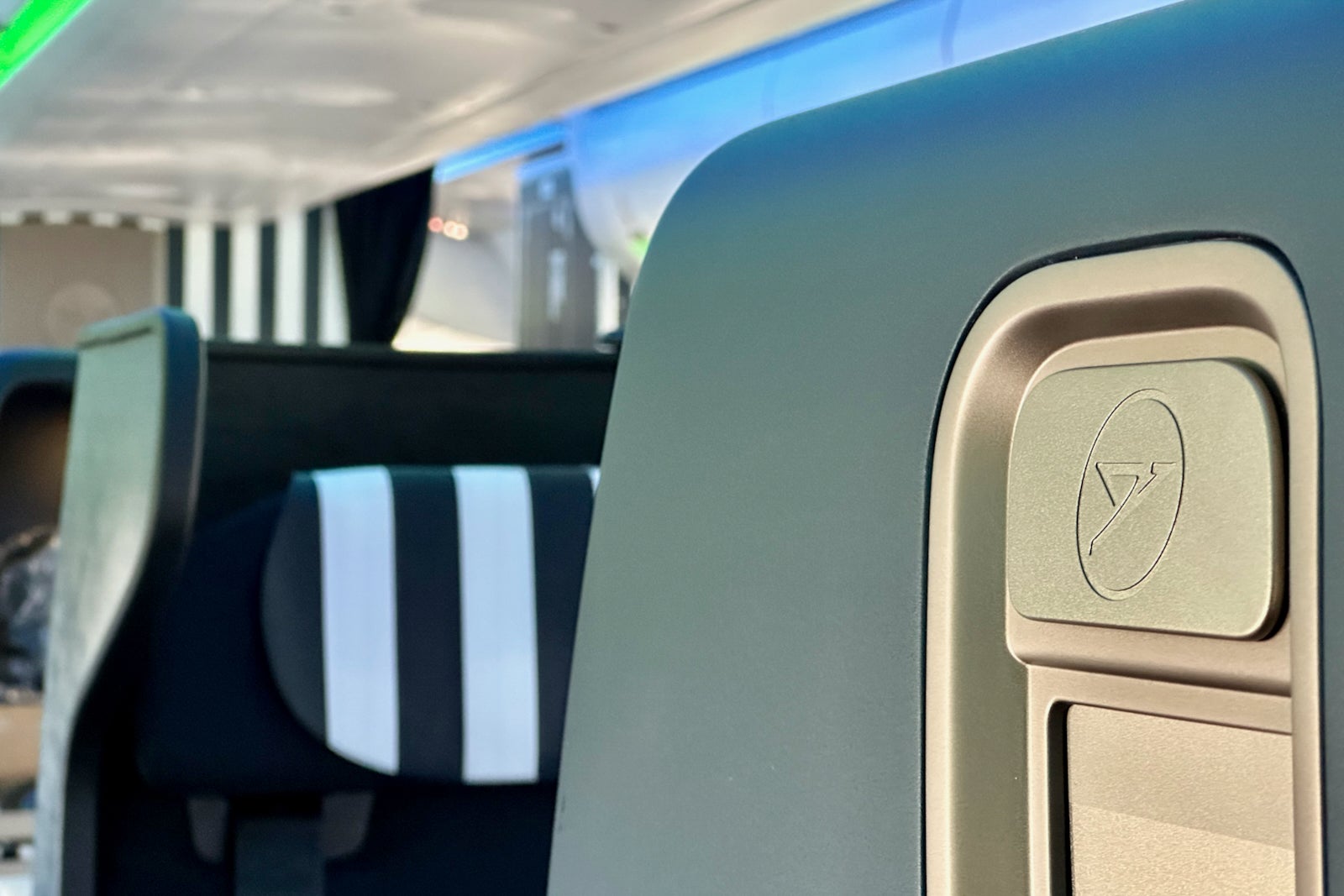 The Safran Skylounge Core business-class pods (which first debuted with Taiwan-based Starlux Airlines last year) are arranged across eight rows in a 1-2-1 configuration, giving each passenger direct aisle access.