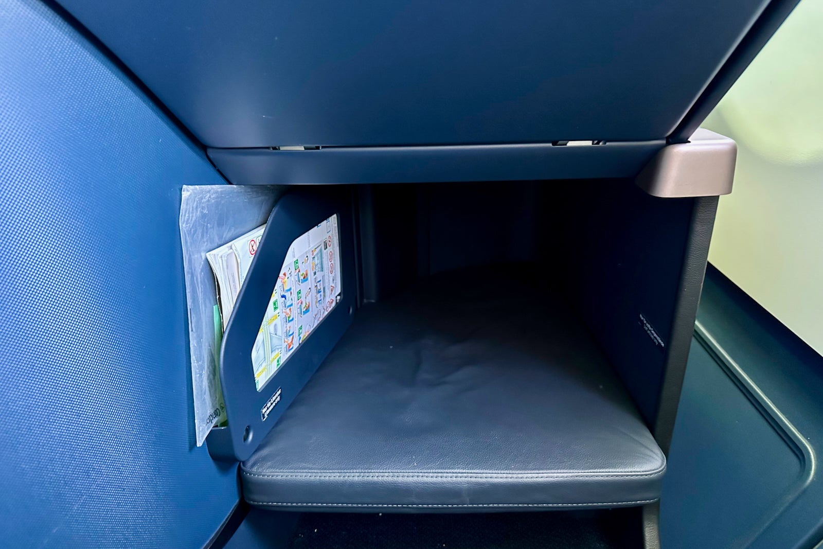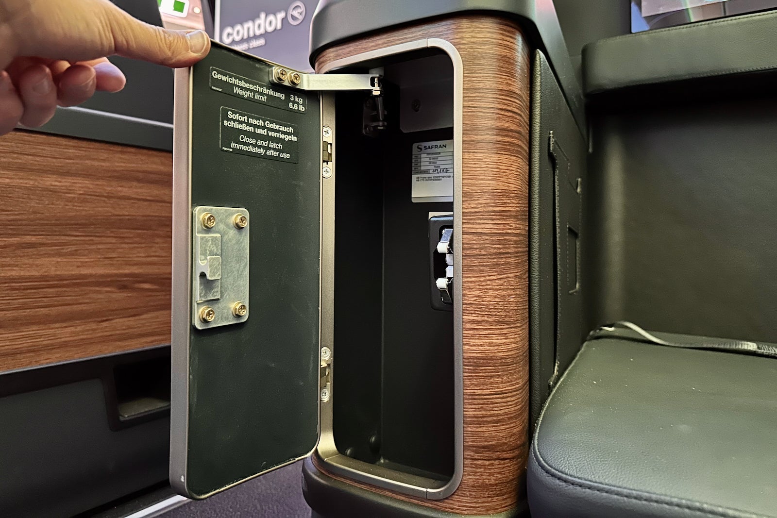 The large side table serves as a great place to stow your loose items during the flight. Just note that there aren't any enclosed storage compartments to leave things like passports and wallets.