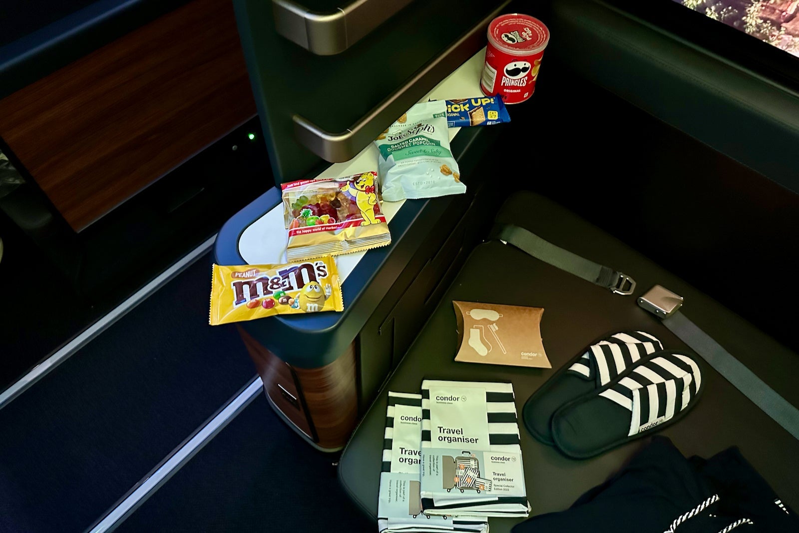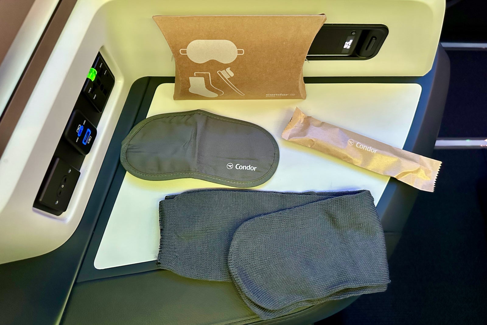 Before takeoff, flight attendants distributed amenity kits to each business-class passenger. Condor is facing supply chain shortages for its new amenity kits, so the airline is currently handing out the premium economy ones instead. They are stocked with a pair of socks, a dental kit and an eye mask all made from recycled materials.