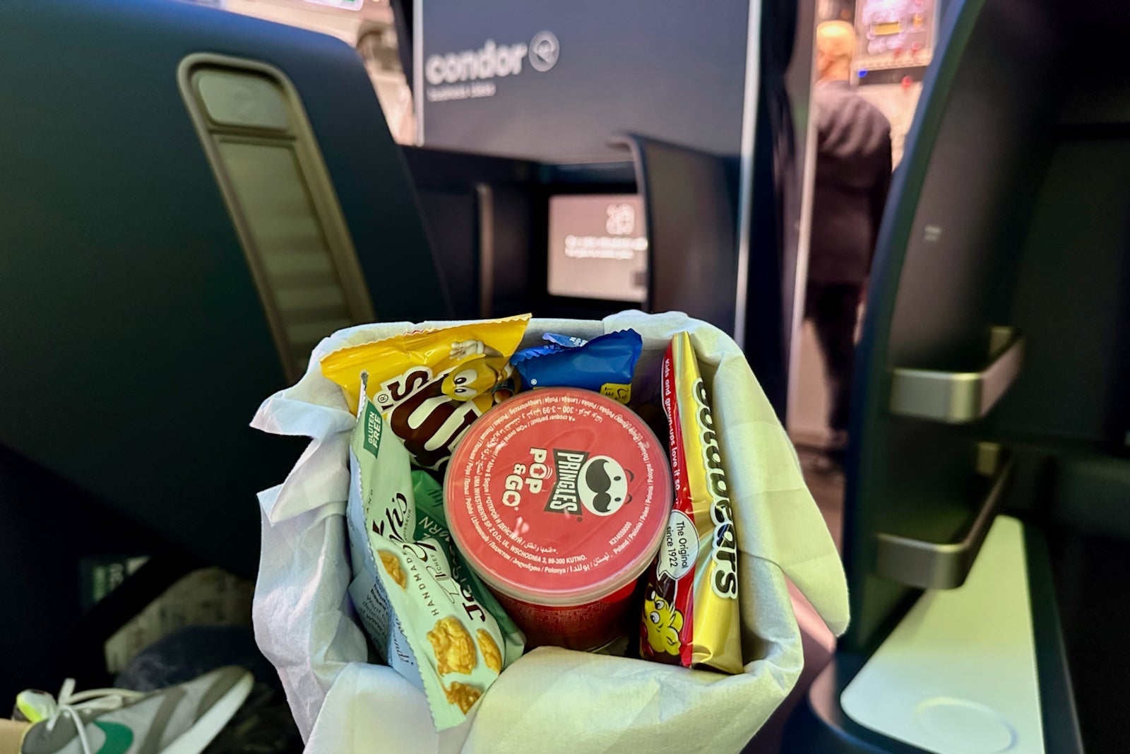 Just like Lufthansa, Condor doesn't offer a snack basket on this route, though the crew was happy to procure some goodies from the buy-on-board menu in economy. I ended up with some cheesy tortilla chips and salsa — a salty treat I enjoyed somewhere over the North Atlantic.