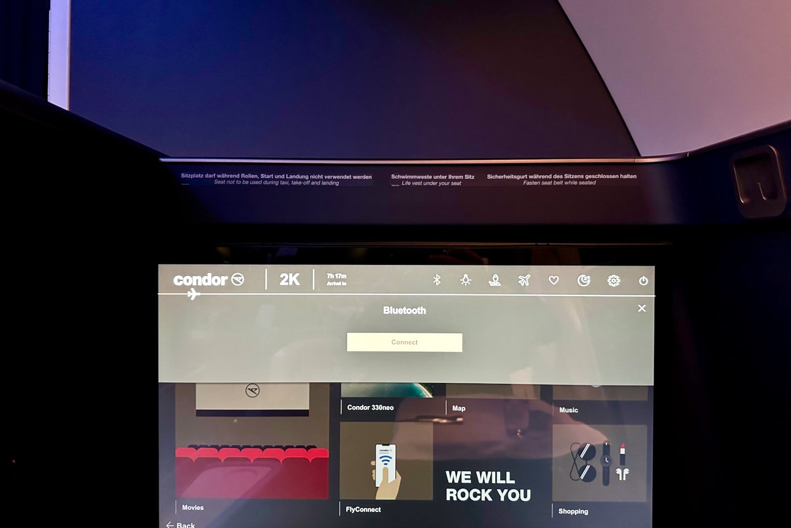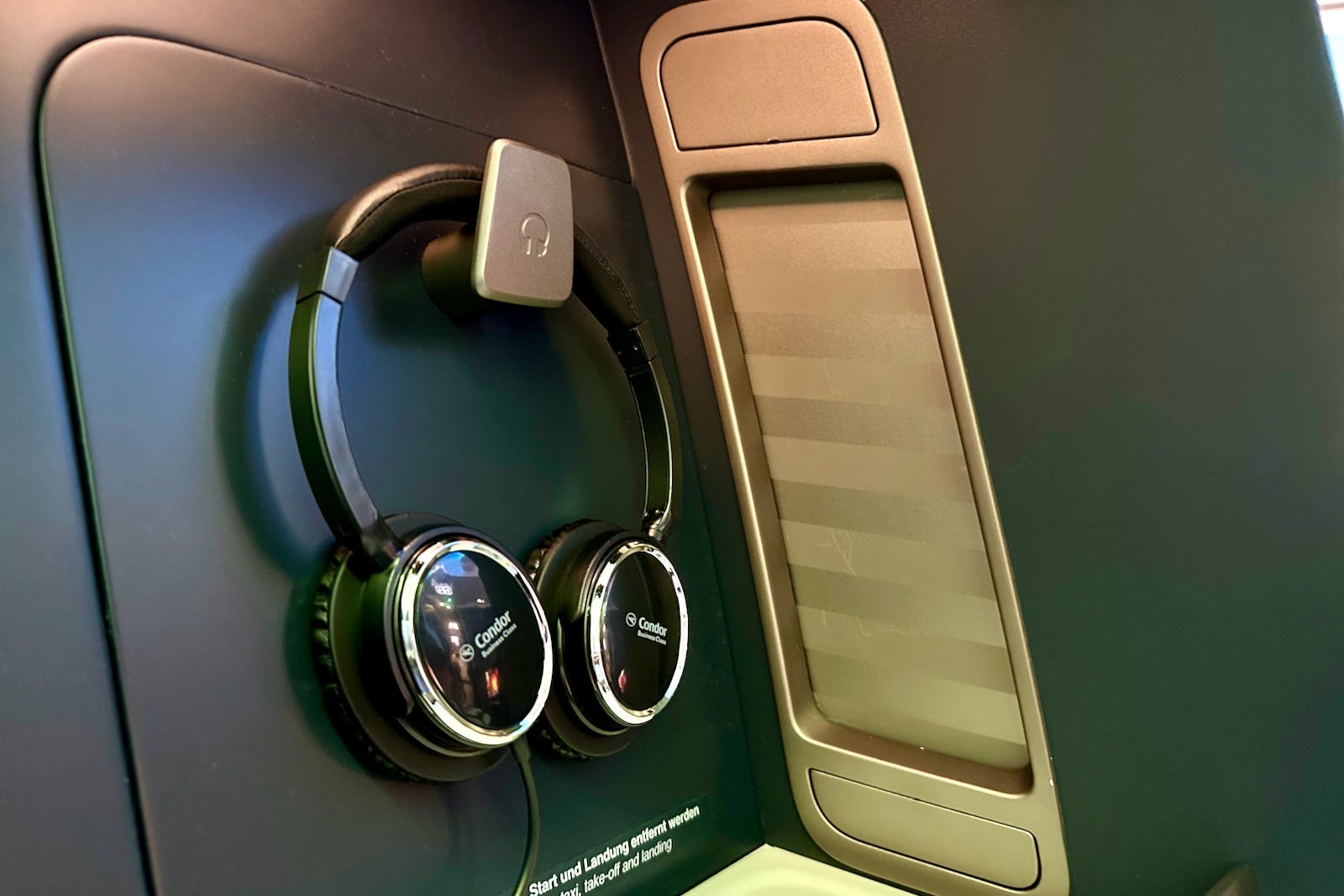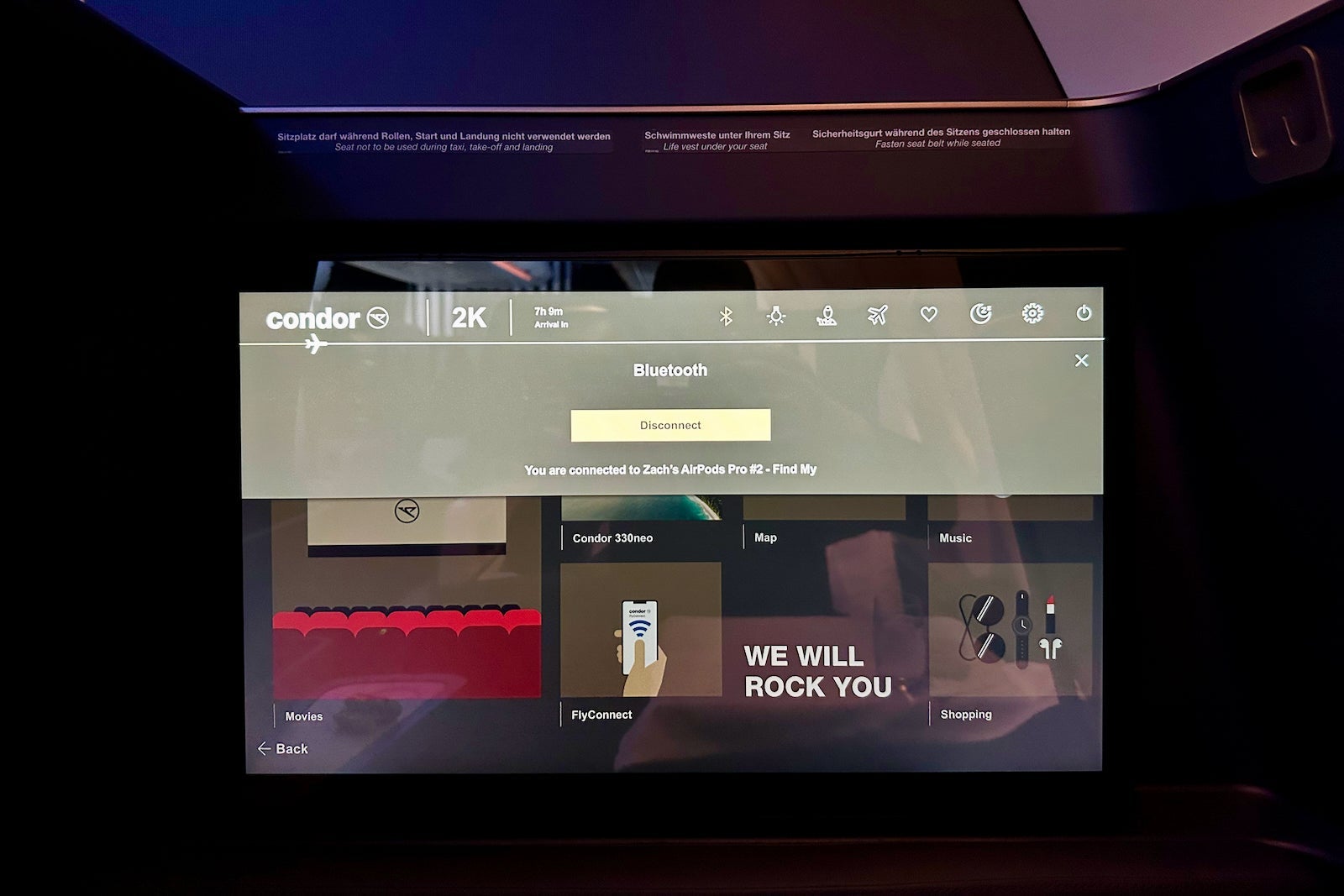 While you can use the provided non-branded headphones, every single seat on Condor's A330neo features Bluetooth audio; you can connect AirPods and other wireless headphones to the seatback entertainment system without any dongles.