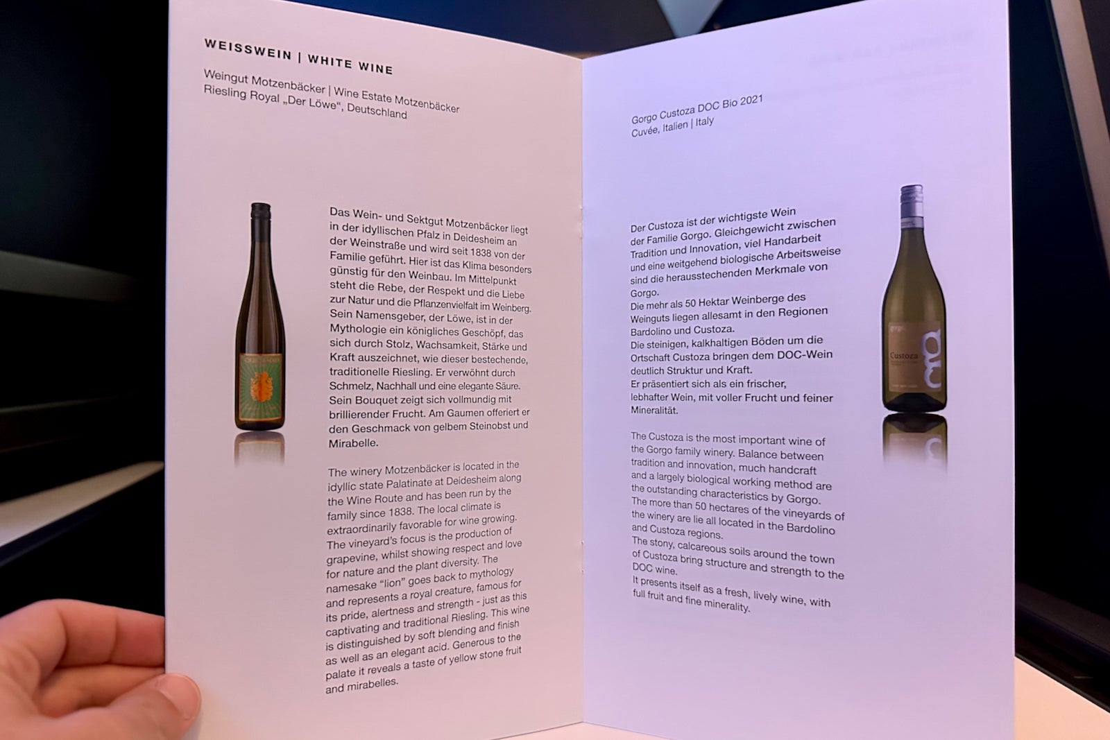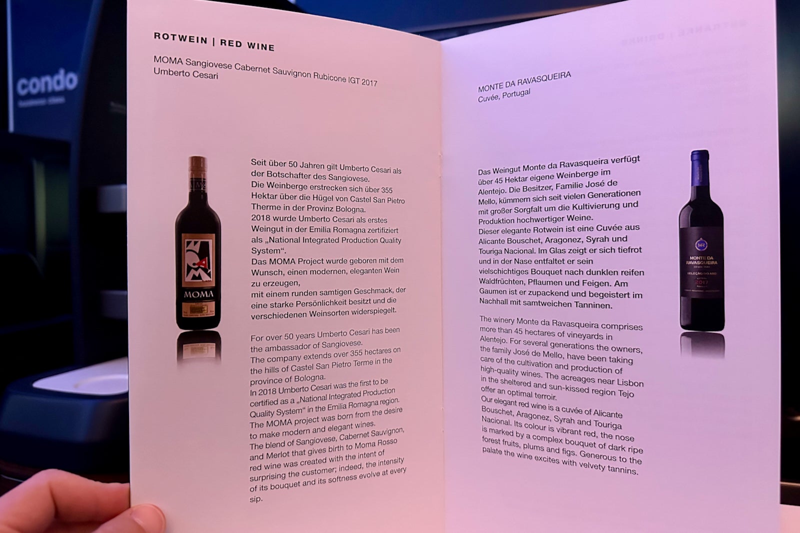 With two red wines, two white wines, Champagne Duval-Leroy Brut and an extensive spirits list (that features Campari), Condor's alcoholic offerings are respectable for a no-frills airline.