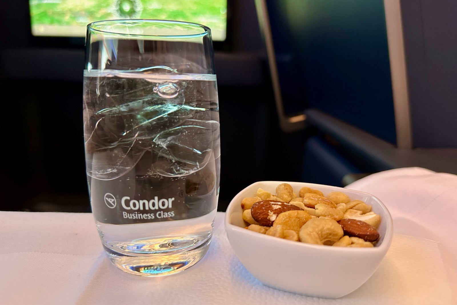 A few minutes later, the drink cart passed through the aisle, and I asked for a glass of ice water, which was served alongside some delicious honey-roasted mixed nuts.