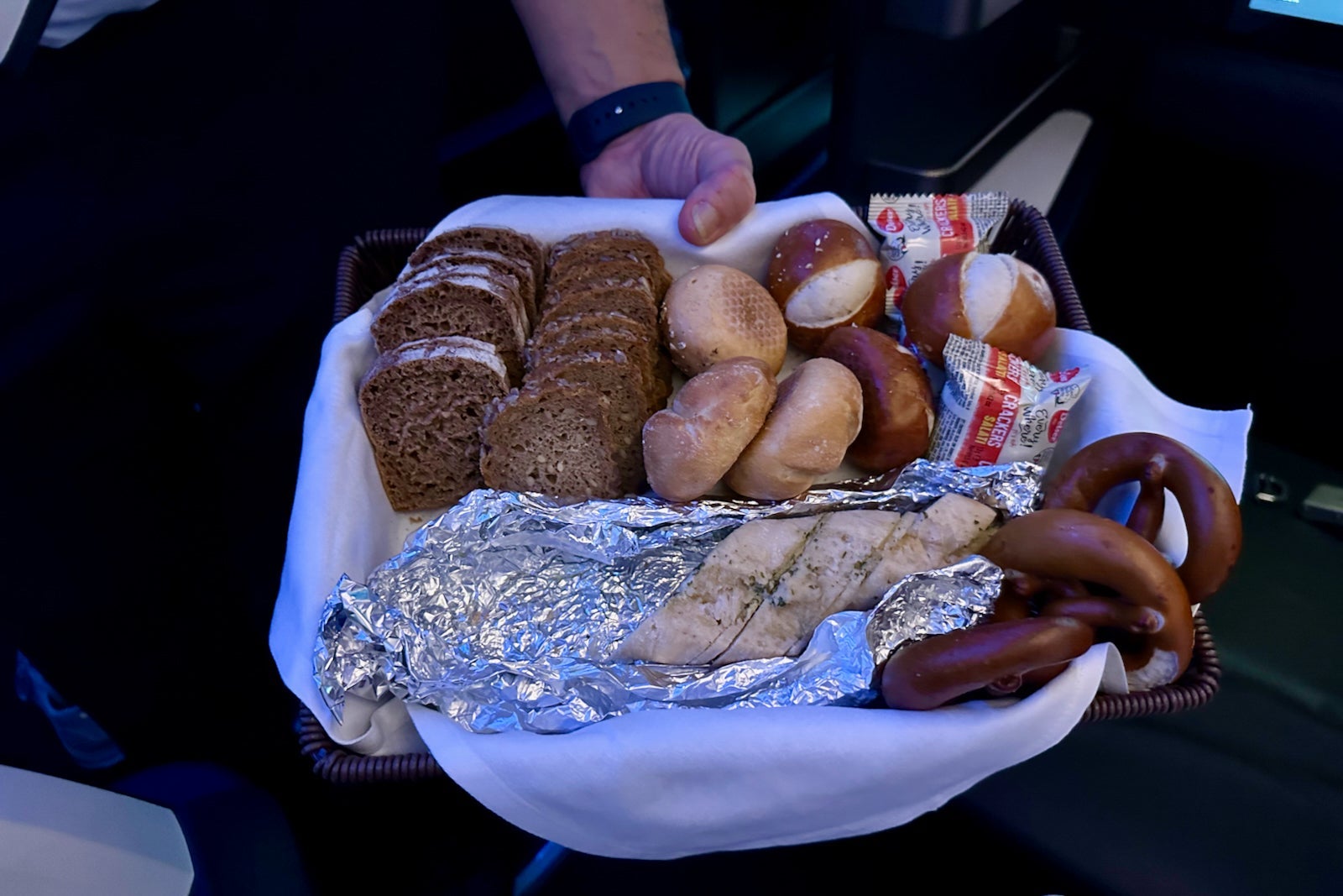 Both airlines offer a similar service flow, a large assortment of bread, a tasty entree, and lackluster (and repetitive) dessert options. That said, Condor beats Lufthansa in terms of snack options.