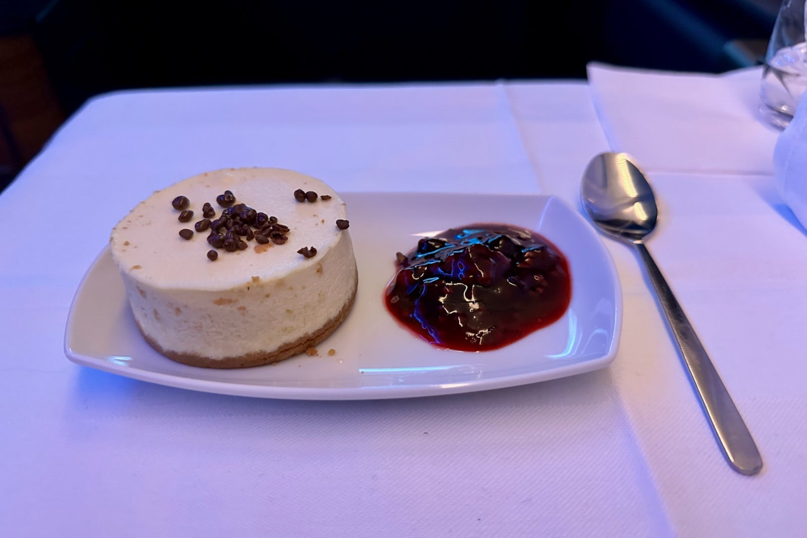 Dessert was served about 90 minutes after takeoff, and while the berry cheesecake looked delectable, I was already full, so I just nibbled at it.