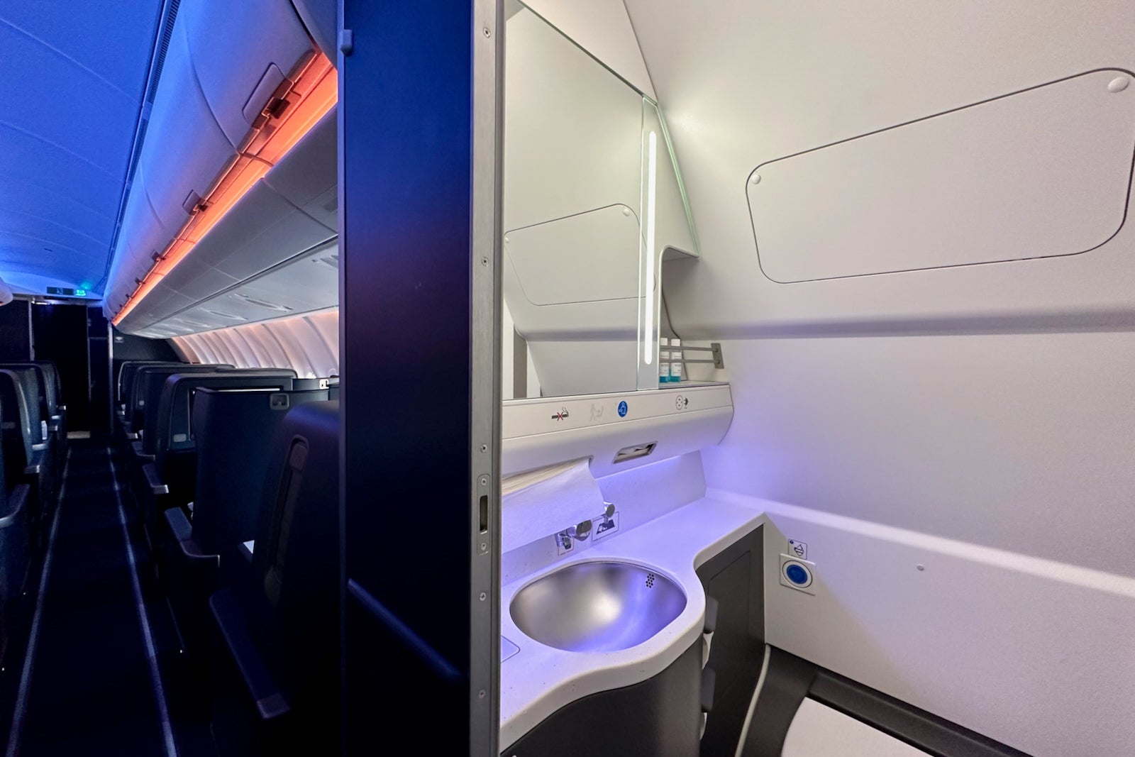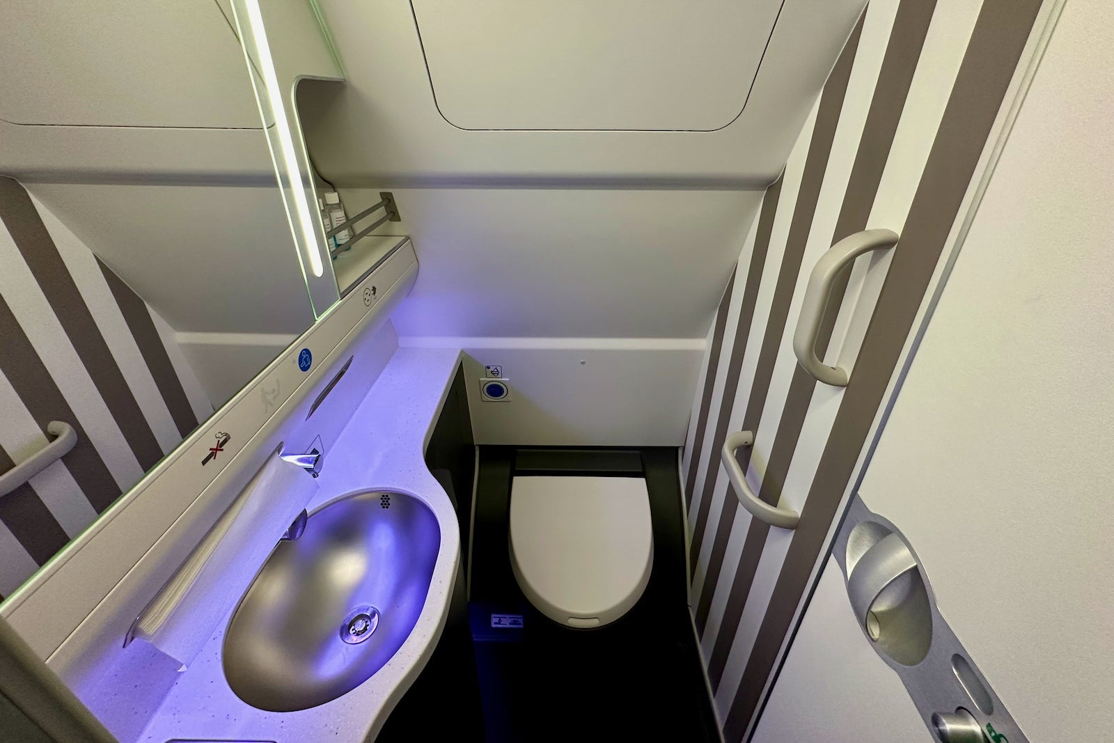 There are two lavatories for business-class passengers: one just behind the flight deck and one on the starboard side between the business-class and premium economy cabins.