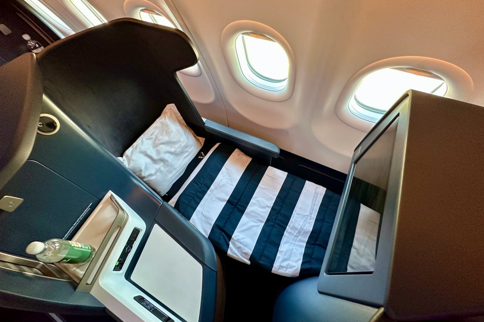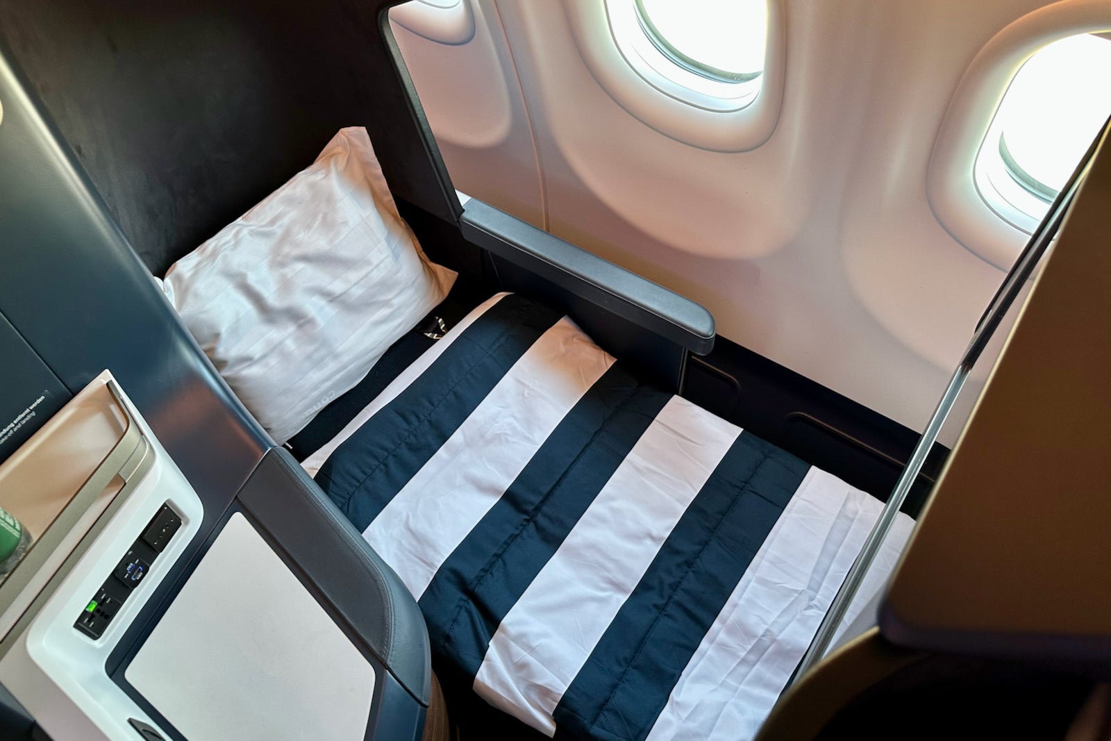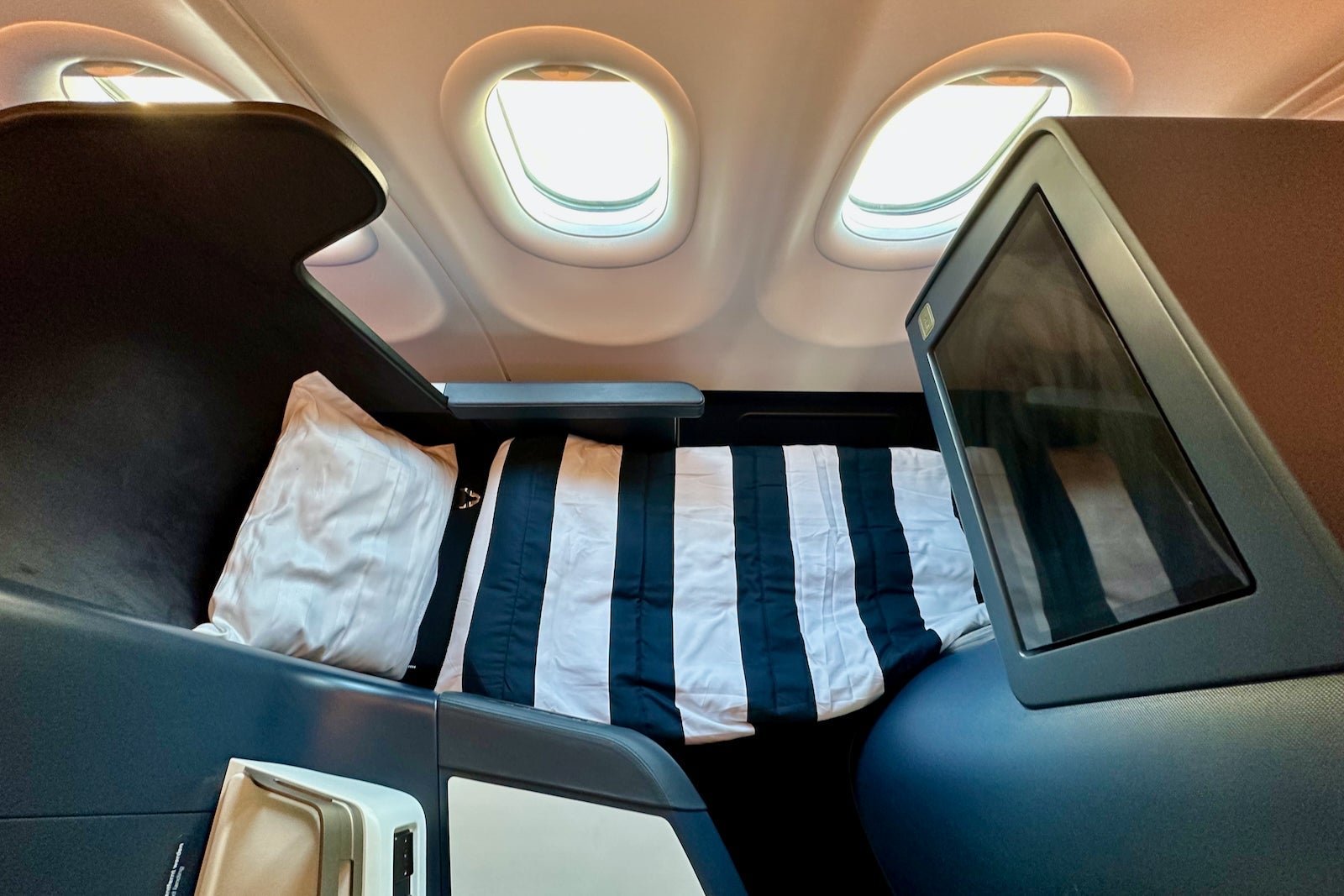 Waiting at each seat during boarding was a plush pillow and navy-blue striped duvet that made it easy to get comfortable during a daytime nap.